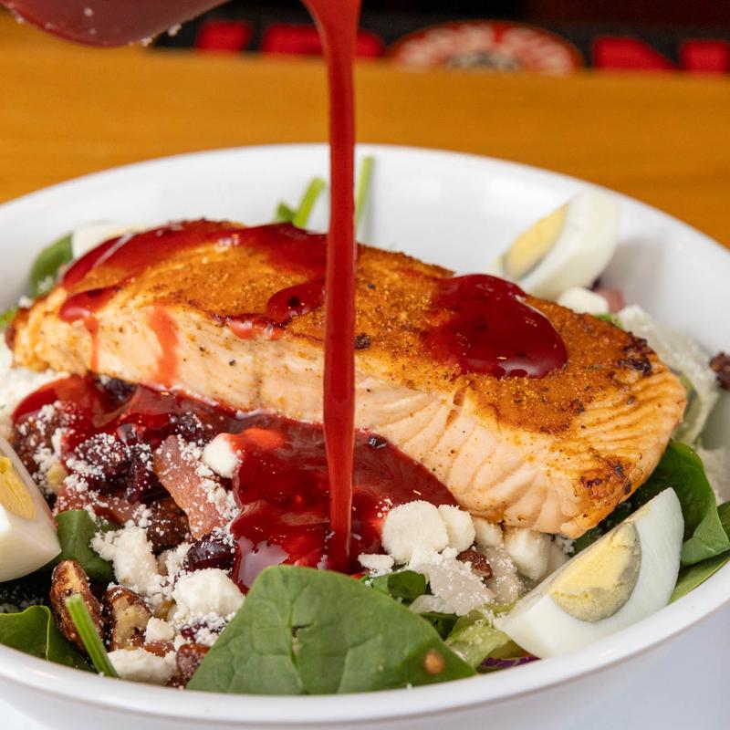 Romain lettuce and spinach, topped with a thick piece of salmon. Mixed base of Pecans, Crasins, Tomatoes, Feta cheese, and a hard boiled egg. Served with raspberry vinaigrette dressing on the side