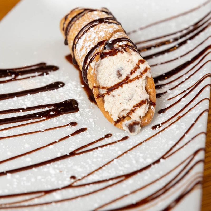 A warm chocolate chip fudge brownie topped with vanilla bean ice cream and caramel and chocolate syrups!
