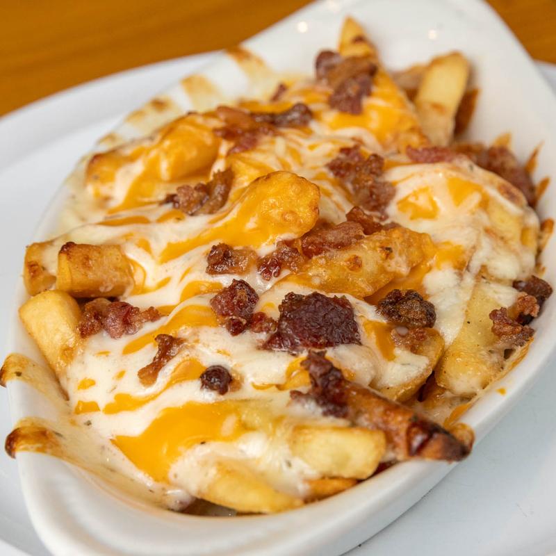 Smothered with nacho cheese and covered with ranch dressing, asiago cheese, and bacon bits.